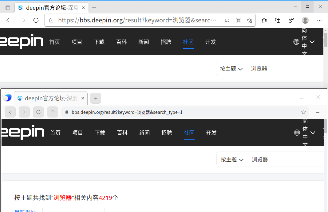 与Edge浏览器比较,UOS浏览器地址栏的字号、符号偏小,看起来不舒服不协调。附截图比较,上Edge浏览器、下UOS浏览器。希望改进一下。