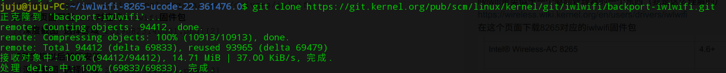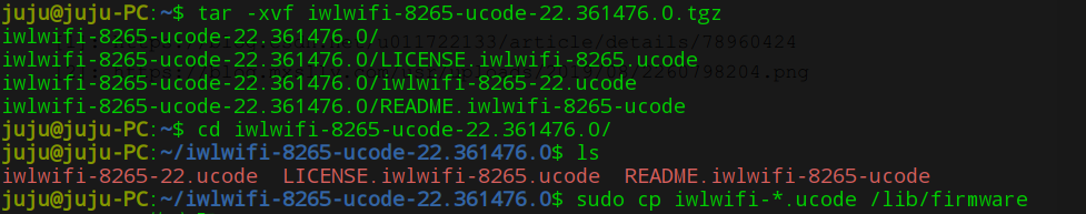 tar -xvf iwlwifi-8265-ucode-22.361476.0.tgzcd iwlwifi-8265-ucode-22.361476.0/lssudo cp iwlwifi-*.ucode /lib/firmware2.下载8265的驱动源码包