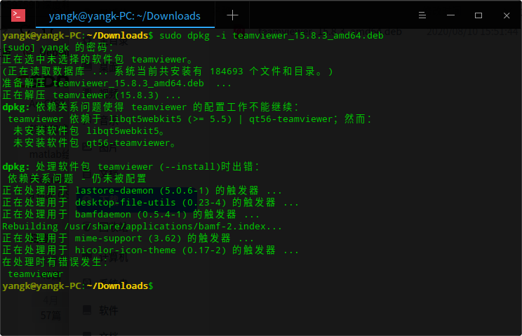 我看看能不能让@jingle 帮你找到技术帮你远程,下载teamview应不存在依赖问题吧,在官网链接下,如果能联系 ...