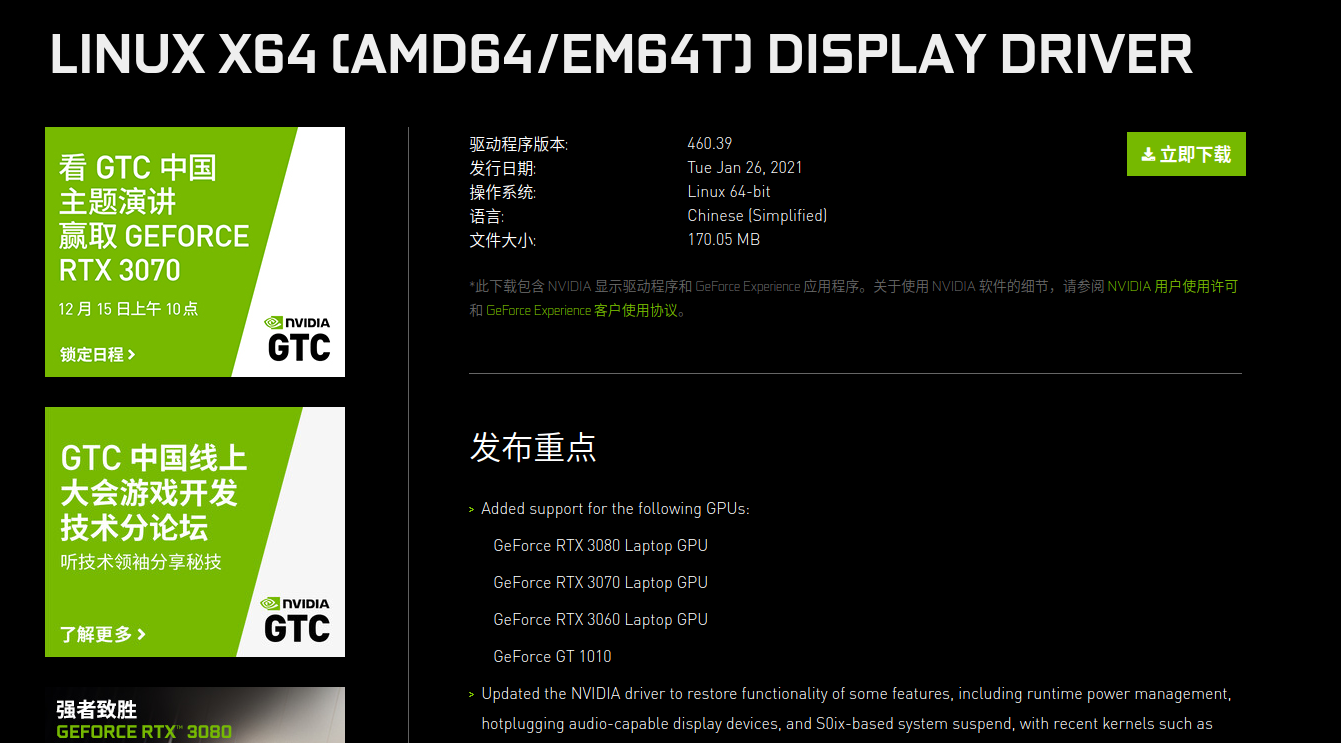 下载驱动地址:https://cn.download.nvidia.com/XFree86/Linux-x86_64/460.39/NVIDIA-Linux-x86_64-460.39.run